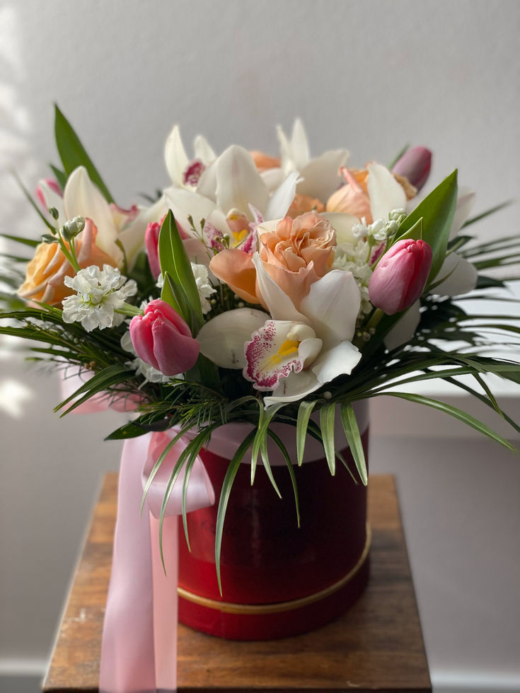 Create a peaceful atmosphere with Calming Blooms, a serene arrangement of tulips, white orchids, and stock. With its soothing colors and tranquil fragrance, this bouquet brings a sense of relaxation and balance, making it the perfect gift for moments of calm and quiet reflection.