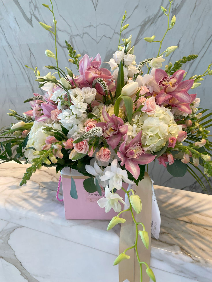 Indulge in the enchanting beauty of Dreamy Delight, a soft and romantic arrangement of pastel roses, orchids, and delicate veronicas. With its gentle hues and graceful design, this bouquet captures the essence of serenity and joy, making it the perfect gift to bring a touch of magic to any occasion.